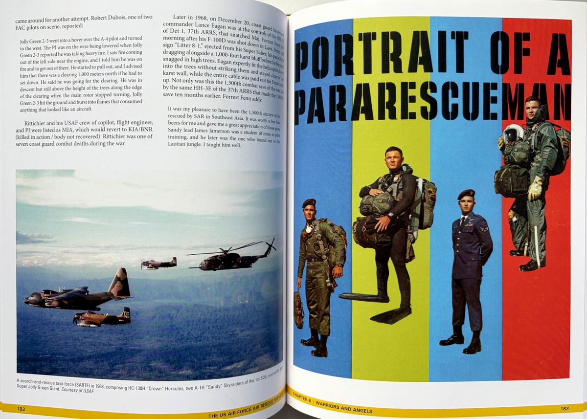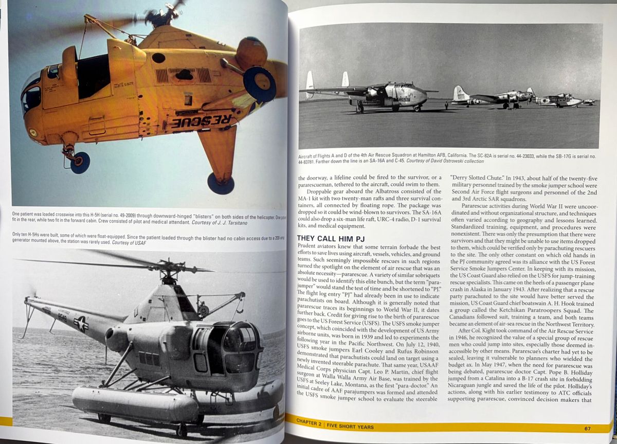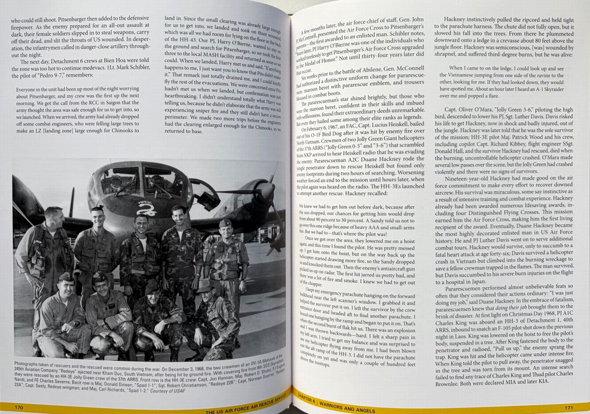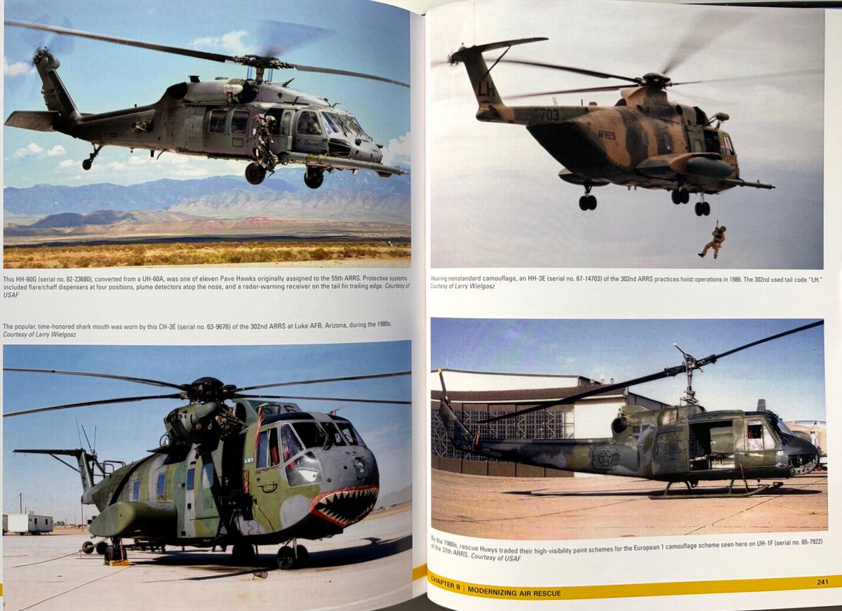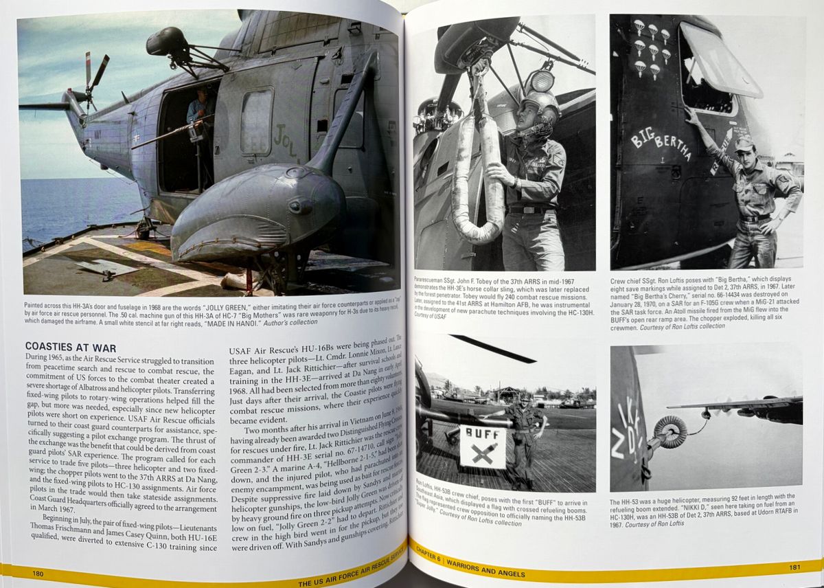 米陸軍航空隊と米空軍の航空救難活動に関する決定版といえる本書は、第二次大戦中の航空救難活動の誕生から朝鮮、ベトナム、そして現代のイラクとアフガニスタンにおける活動までその軌跡へと導く。 詳細な解説と多数の写真(初公開写真を含む)は、航空救難活動のあらゆる側面、すなわち航空救難活動の創設、専門訓練と装備、そしてスティンソンL-5、ダグラスSC-47、ダグラスHC/SC-54D「レスキューマスター」、フェアチャイルドSC-82A「パケット」、ボーイングHC-97G「ストラト・レスキュー」、ベルH-1「ヒューイ」、シコルスキーH-3「ジョリー・グリーン・ジャイアント」等、様々な航空機に関する解説を網羅。 冷戦期には航空救難活動は大きく拡大し、米国宇宙計画の初期には宇宙飛行士救助という新たな任務が加わり、また世界各地で発生した自然災害においても人道支援活動を展開した。航空救助隊はベトナム戦争でその真価を発揮し、高度な技能と効果的な部隊として、戦闘で撃墜された数千人のパイロットや、苦境に立たされた地上部隊を救助した。現在の米空軍航空救助隊は、「他者が生き残るために」というモットーを掲げ、今もなお活動し続けている。 ベトナムの部分は一部ではあるが、上記のとおり、救難隊の歴史の重要な一部となっている。 220x285o, 287pp, HC, 英語