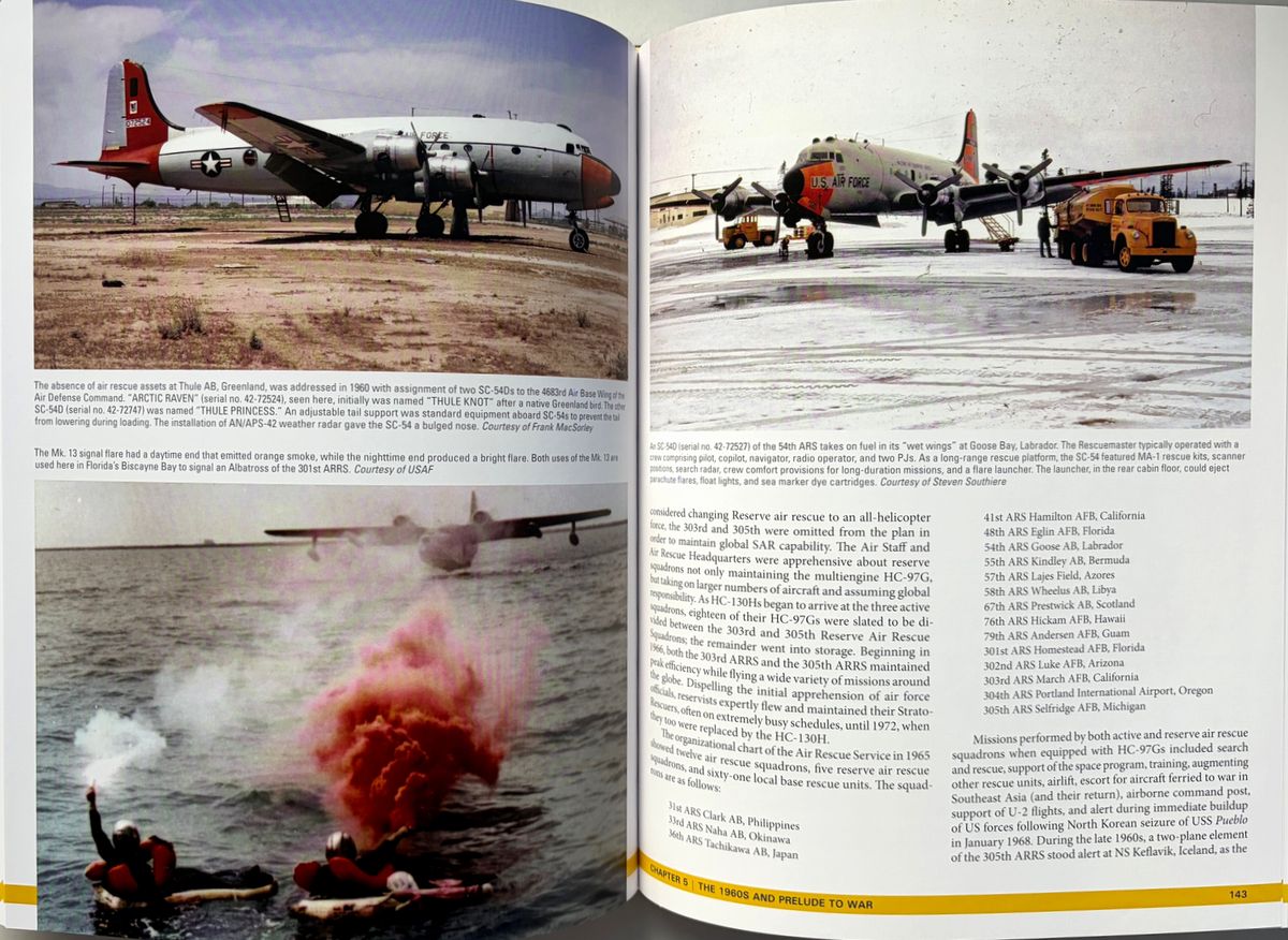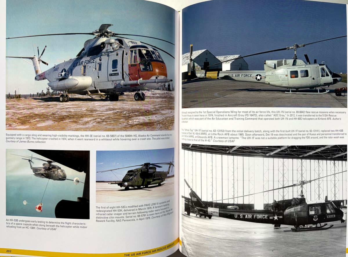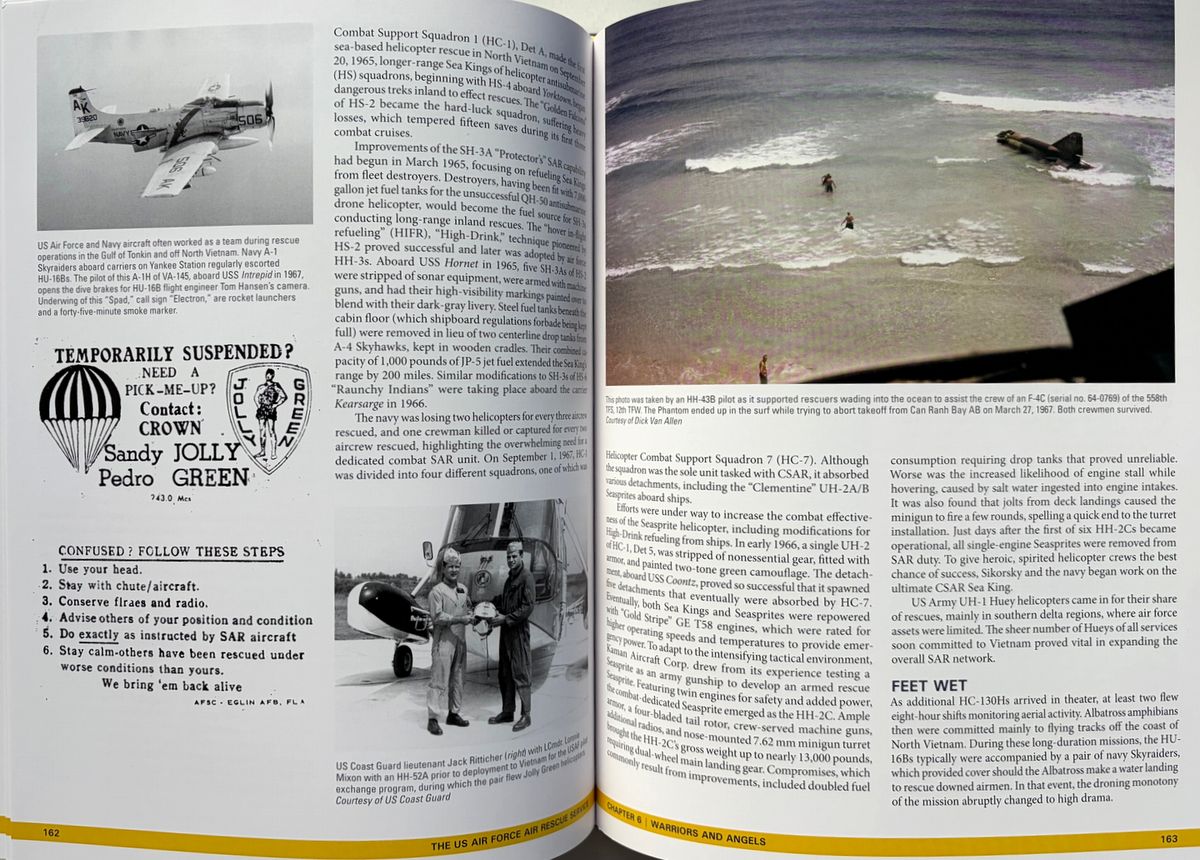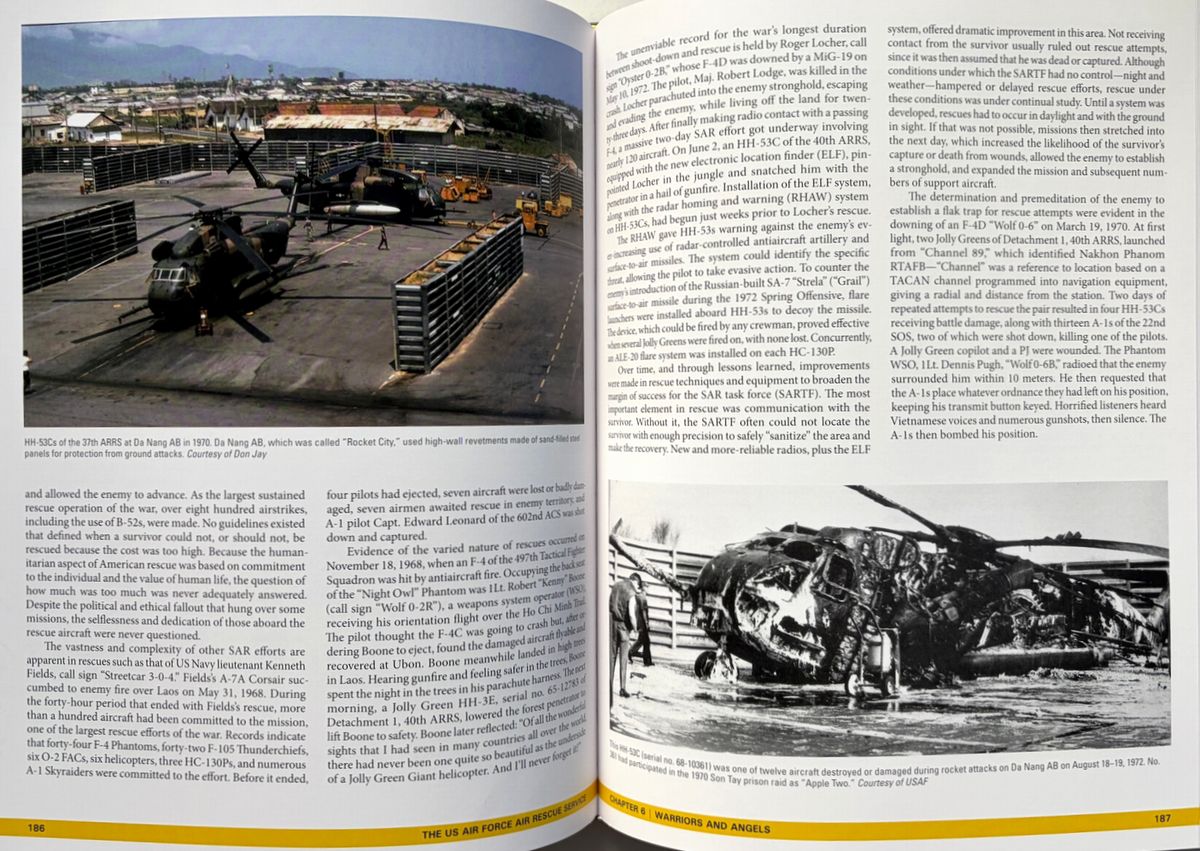 米陸軍航空隊と米空軍の航空救難活動に関する決定版といえる本書は、第二次大戦中の航空救難活動の誕生から朝鮮、ベトナム、そして現代のイラクとアフガニスタンにおける活動までその軌跡へと導く。 詳細な解説と多数の写真(初公開写真を含む)は、航空救難活動のあらゆる側面、すなわち航空救難活動の創設、専門訓練と装備、そしてスティンソンL-5、ダグラスSC-47、ダグラスHC/SC-54D「レスキューマスター」、フェアチャイルドSC-82A「パケット」、ボーイングHC-97G「ストラト・レスキュー」、ベルH-1「ヒューイ」、シコルスキーH-3「ジョリー・グリーン・ジャイアント」等、様々な航空機に関する解説を網羅。 冷戦期には航空救難活動は大きく拡大し、米国宇宙計画の初期には宇宙飛行士救助という新たな任務が加わり、また世界各地で発生した自然災害においても人道支援活動を展開した。航空救助隊はベトナム戦争でその真価を発揮し、高度な技能と効果的な部隊として、戦闘で撃墜された数千人のパイロットや、苦境に立たされた地上部隊を救助した。現在の米空軍航空救助隊は、「他者が生き残るために」というモットーを掲げ、今もなお活動し続けている。 ベトナムの部分は一部ではあるが、上記のとおり、救難隊の歴史の重要な一部となっている。 220x285o, 287pp, HC, 英語